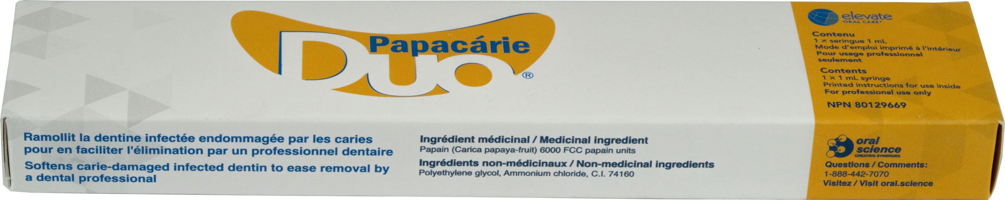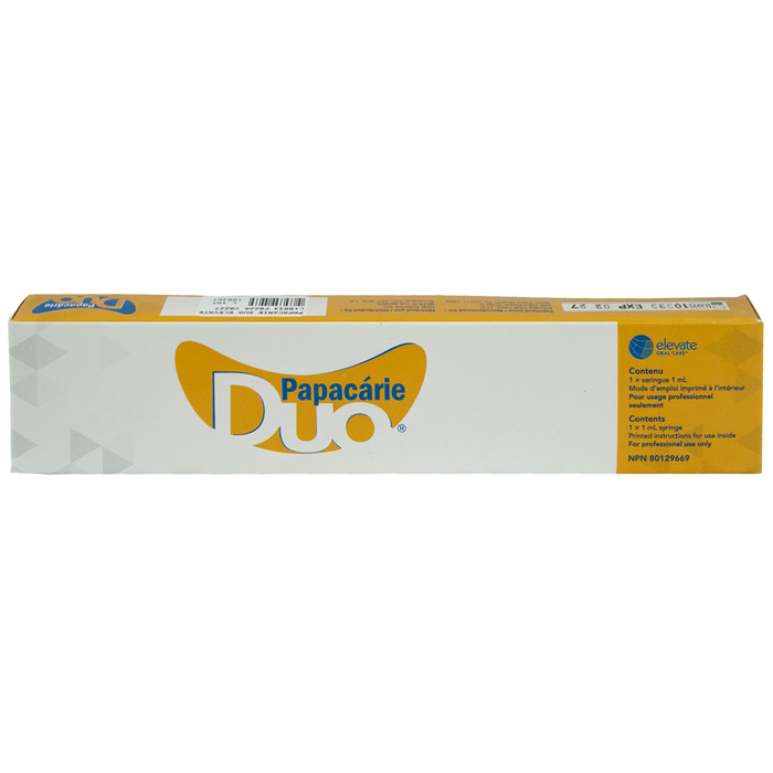 0.1–3 mL, 1 time per day. To be used by a dental professional. Papacárie Duo® only reacts in contact with caries-damaged dentin. Healthy tooth tissue is unaffected by the active ingredient.